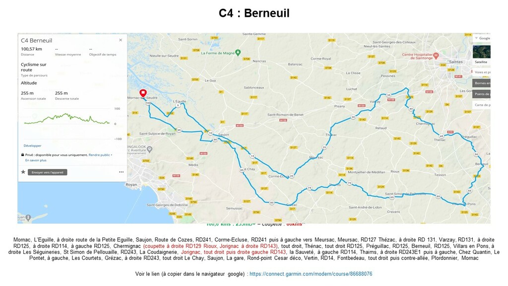 Mornac, L’Eguille, à droite route de la Petite Eguille, Saujon, Route de Cozes, RD241, Corme-Ecluse, RD241 puis à gauche vers Meursac, Meursac, RD127 Thézac, à droite RD 131, Varzay, RD131, à droite RD125, à droite RD114, à gauche RD125, Chermignac (coupette à droite RD129 Rioux, Jorignac à droite RD143), tout droit, Thénac, tout droit RD125, Préguillac, RD125, Berneuil, RD125, Villars en Pons, à droite Les Séguineries, St Simon de Pellouaille, RD243, La Coudaignerie, Jorignac, tout droit puis droite gauche RD143, la Sauveté, à gauche RD114, Thaims, à droite RD243E1 puis à gauche, Chez Quantin, Le Pontet, à gauche, Les Courtets, Grézac, à droite RD243, tout droit Le Chay, Saujon, La gare, Rond-point Cesar déco, Vertin, RD14, Fontbedeau, tout droit puis contre-allée, Plordonnier, Mornac