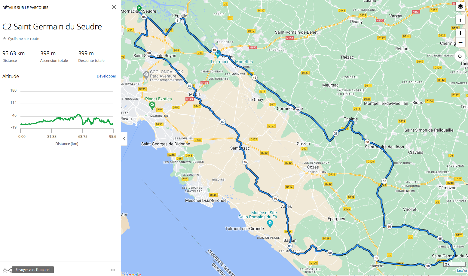 Mornac - Fontbedeau - L'Eguille direction Saujon - Port de Saujon tout droit Cours Victor Hugo et tout droit par D.17 jusqu'à Corme Ecluse - Tout droit par D.241jusqu'à Genset et tourne à gauche jusqu'à Thaims - Prendre à droite direction Saint André de Lidon par D.243 - tout droit par route de Mortagne - jusqu'à Chez Touchay et tout droit par D.139 jusqu'à La Vacherie et tourne à gauche D.246 jusqu'à Saint Germain du Seudre - retour direction Touvent - Les Rimondières par D.139 direction Chenac Saint Seurin d'Uzet - Chenac vers Le Grand Village et redescente vers Les Monnards - Barzan - Arces - Semussac - Medis - Saint Sulpice de Royan - Fontbedeau - Mornac.