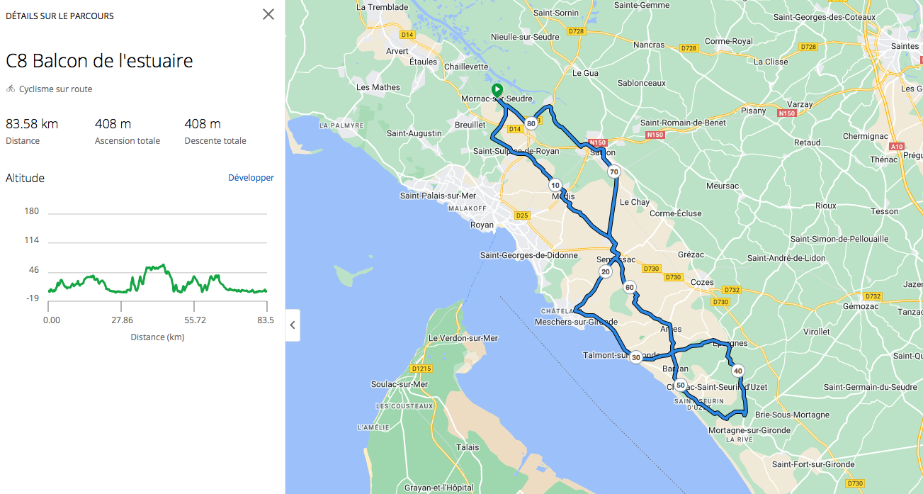 Mornac- Plordonnnier - La Cabane - Saint Sulpice de Royan - direction Medis par Les Maries D.140 - Trignac vers Semussac - D.117 jusqu'au carrefour Pompiers Meschers sur Gironde - à gauche jusqu'à Talmont et sortie Talmont prendre à gauche route romaine vers Epargnes puis tourne à droite par D.245 - a Font Paques tourne à droite par D.145 - et retour par Saint Seurin d'Uzet - Les Monnards - Barzan - Arces - direction Semussac et direction Saujon par D.117 - retour par l'Eguille - Fontbedeau - Mornac.